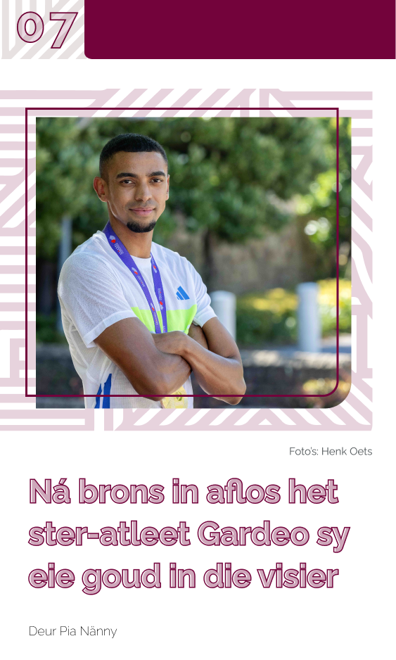 Die voormalige Maties-baanuitblinker Gardeo Isaacs lê weer ’n ander soort dapperheid aan die dag. Om ’n brons medalje te wen as deel van Suid-Afrika se span in die 4 x 400 m-aflos vir mans by die Wêreldatletiekkampioenskap in Tokio was ’n oomblik wat deur jare se dissipline en opoffering voorafgegaan is. Nou werk hy vasberade voort om sy droom van ’n individuele goud op die wêreldverhoog te bewaarheid.