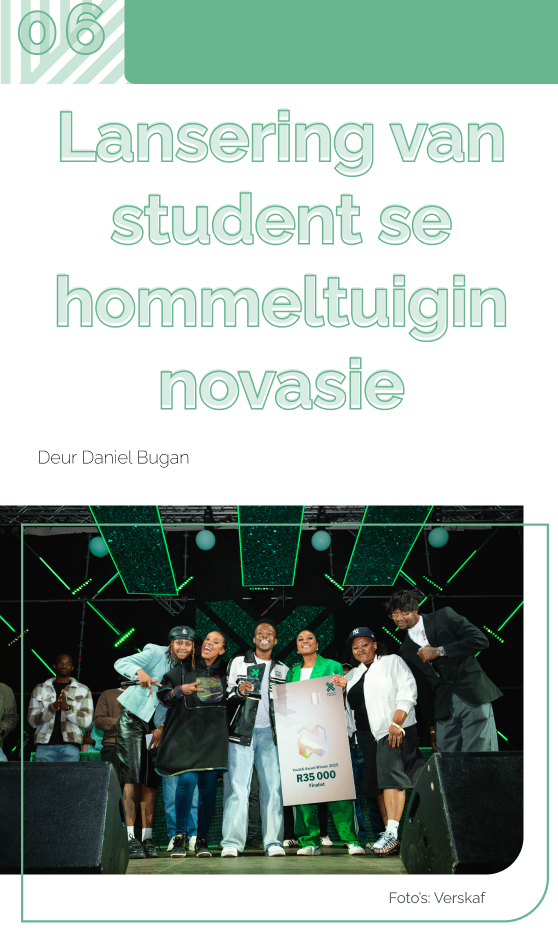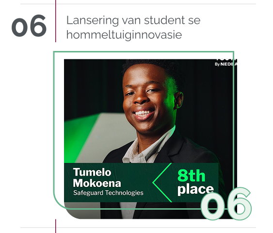 Suid-Afrikaners se deurlopende stryd teen misdaad het eerstejaar- elektriese en elektroniese ingenieurswese-student, Tumelo Mokoena, geïnspireer om SafeGuard Technologies te ontwerp – ʼn innovasie wat van outonome hommeltuie gebruik maak om gemeenskapsveiligheid te verbeter. Sy werk het onlangs vir hom ʼn plek onder Suid-Afrika se top 10 innoveerders by die 2025 YouthX Nedbank-toekennings losgeslaan.