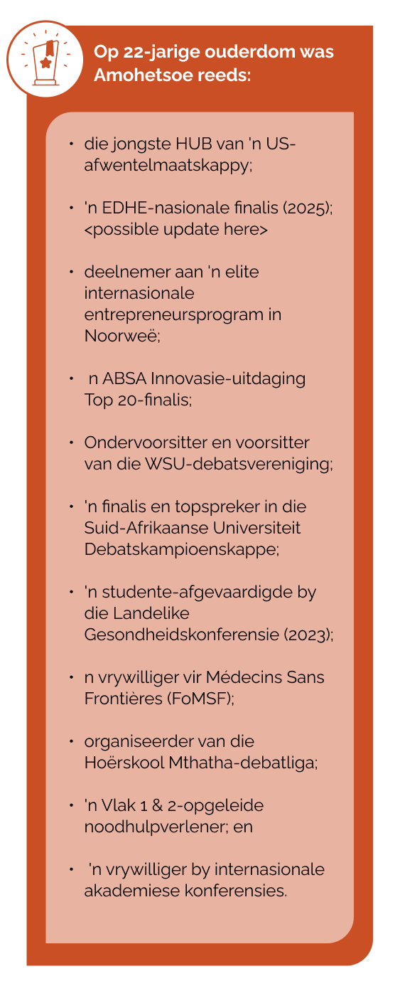 Amohetsoe is die jongste hoof- uitvoerende beampte (HUB) ooit van 'n afwentelmaatskappy van die Universiteit Stellenbosch en sy lei haar maatskappy, NAVU, met 'n doelgerigtheid wat ver bo haar jare uitstyg. Sy was net 21 toe sy in 2024 NAVU in 2024 met die ondersteuning van die US LaunchLab (veral Nadine Price) en Innovus gestig het.
